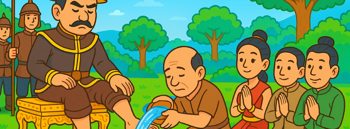 พิธีนี้มีลักษณะของการหยามเกียรติอย่างรุนแรง โดยพระองค์เสด็จประทับบนที่สูง และโปรดให้พระยาละแวกหมอบอยู่เบื้องล่าง แล้วทรงราดน้ำล้างพระบาทลงบนศีรษะของพระยาละแวก การกระทำนี้ถือว่ามีความหมายลึกซึ้ง เพราะในบริบทของยุคโบราณ การที่กษัตริย์กระทำเช่นนี้กับกษัตริย์อีกพระองค์ เปรียบเสมือนการลดพระยศของฝ่ายตรงข้ามให้ตกต่ำเป็นเหมือนทาสหรือผู้ไร้ศักดิ์ศรีโดยสิ้นเชิง ก่อนจะนำตัวไปประหารชีวิตต่อไป